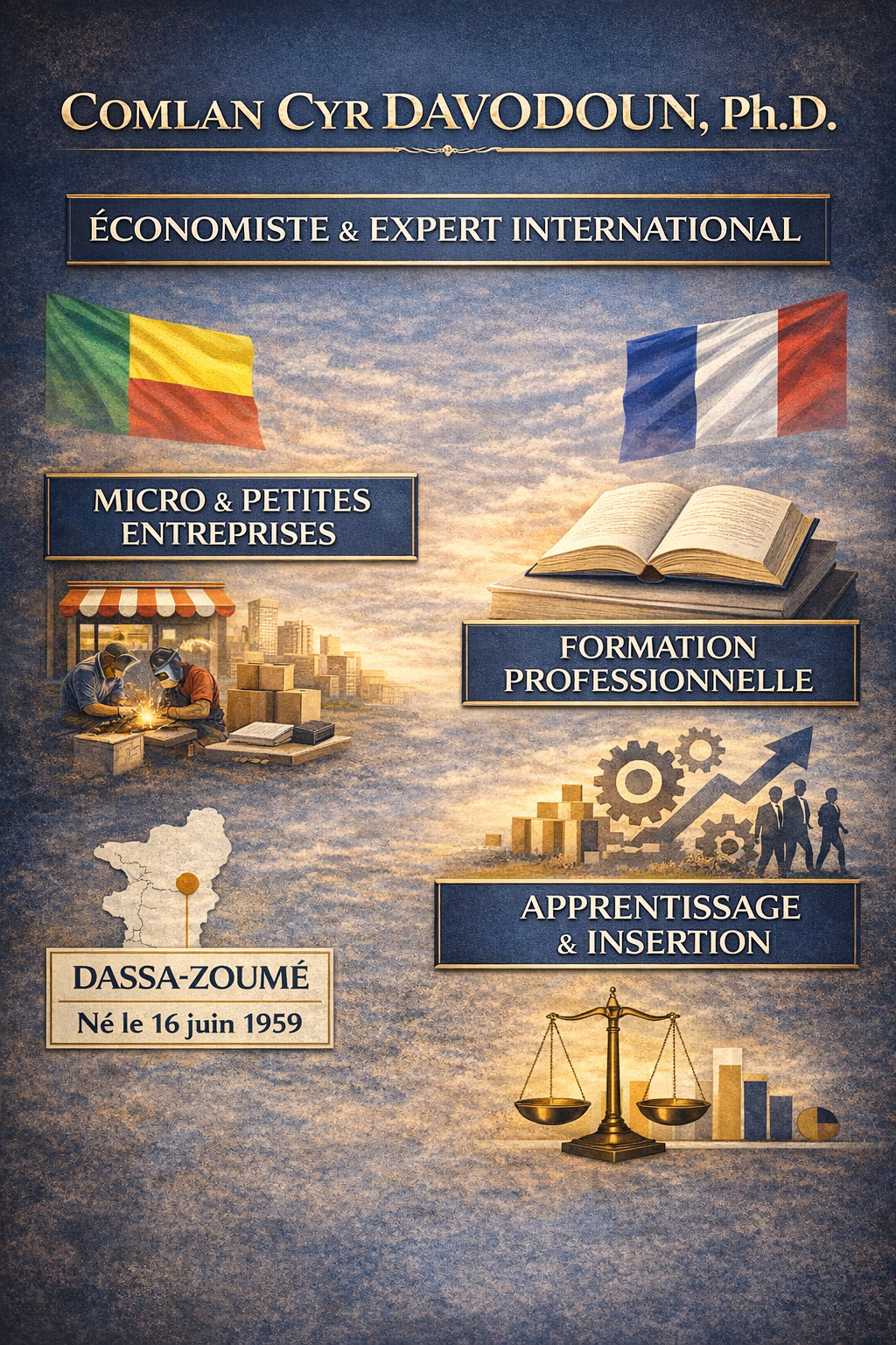 comlandavodoun@gmail.comComlan Cyr DAVODOUN, Ph D, est économiste et administrateur du développement, expert international. Il est spécialisé dans le développement du secteur privé, notamment des micro et petites entreprises (MPE), ainsi que dans la conception et la mise en œuvre de systèmes de formation professionnelle continue, d’apprentissage et d’insertion socioprofessionnelle. Il est également analyste politique et essayiste.